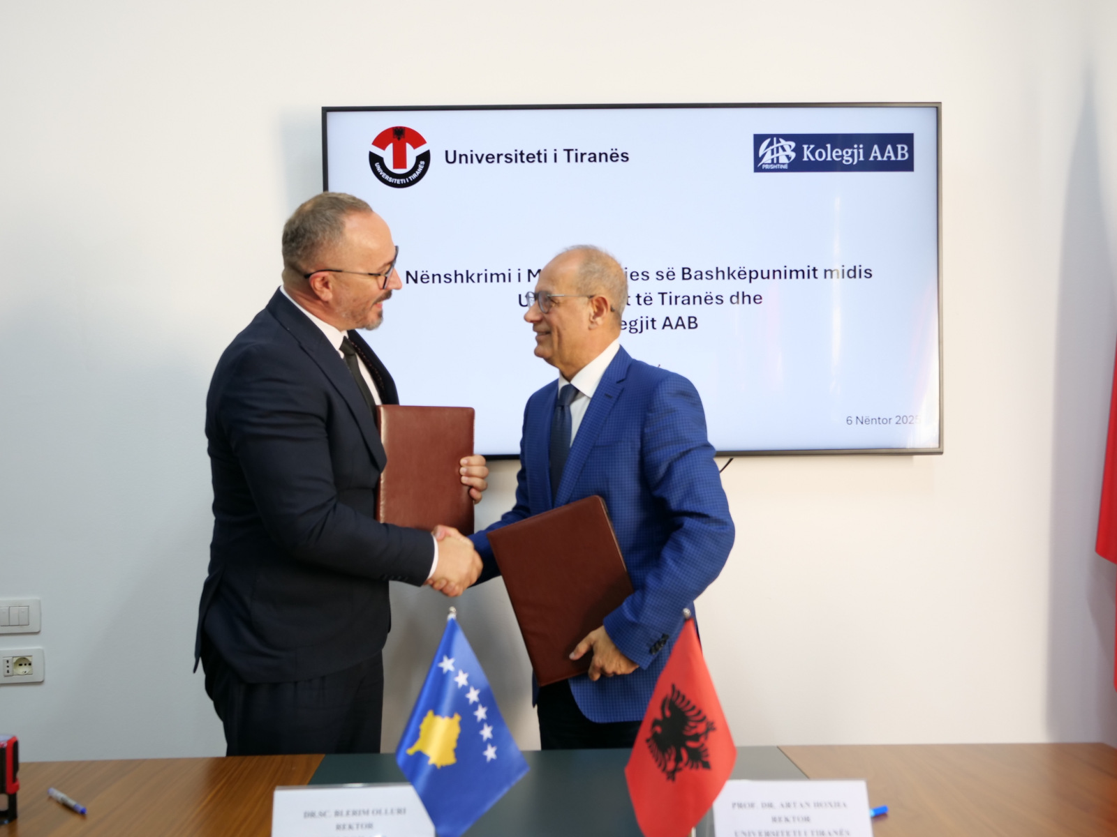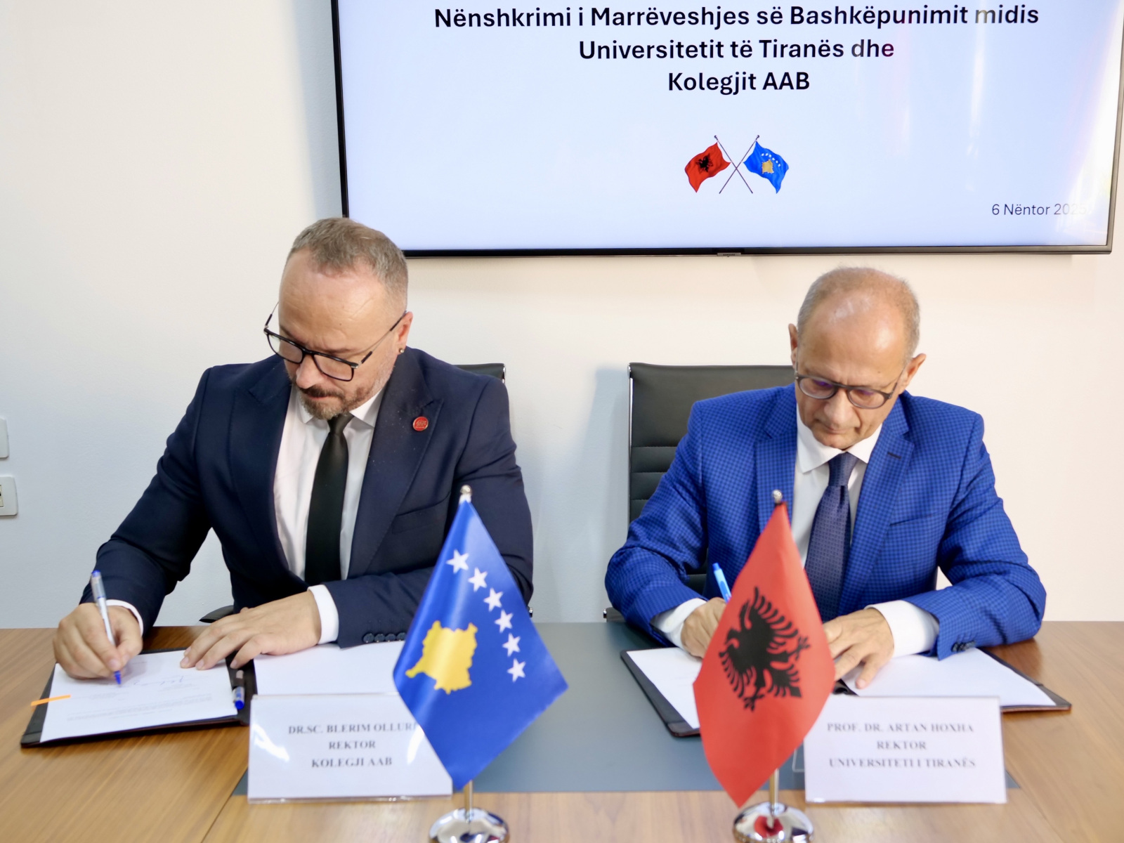 Rektori i Universitetit të Tiranës, Prof. Dr. Artan Hoxha, nënshkroi sot Marrëveshje Partneriteti dhe Bashkëpunimi me Rektorin e Kolegjit AAB të Kosovës, Dr. Sc. Blerim Olluri.